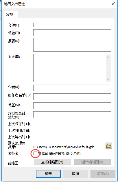我们存储地图文档时一般存储为相对路径,否则当再次打开文本文档时,地图文档无法为其自动匹配数据。设置相对路径的步骤为:单击主菜单中的【文件】,在下拉框中选择【地图文档属性】选项,在打开的对话框中勾选相对路径选项,如下图所示: